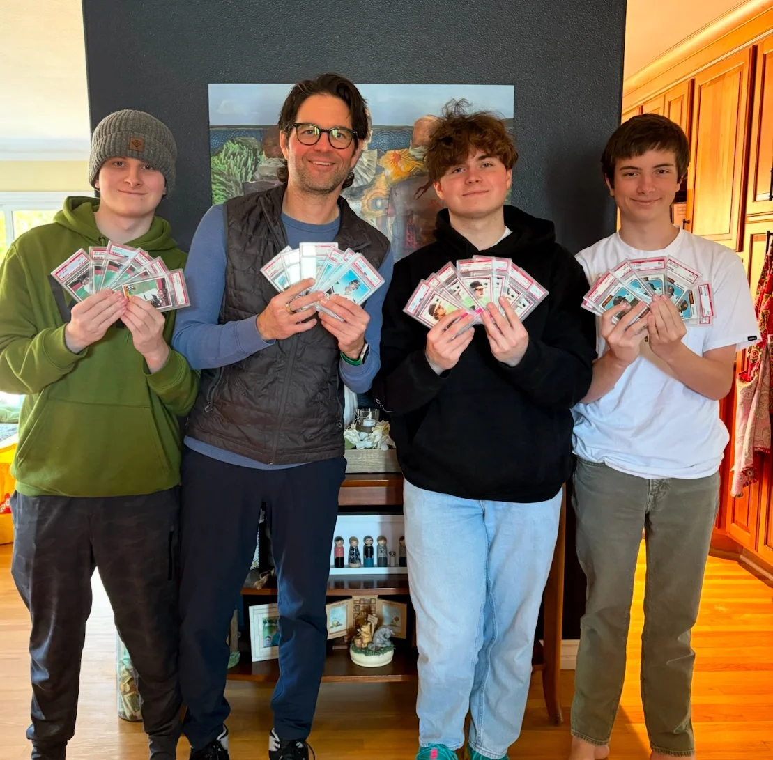 Photograph of Mike Sadek Jr. and sons, holding Sadek Jr.’s card collection. Courtesy of Sadek family.